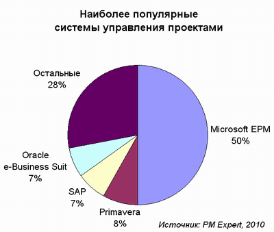 По данным опроса, проведенного PM Expert, автоматизация процесса управления проектами полностью отсутствует всего в 3% российских компаний, однако 55% используют для планирования и контроля проектов локальное программное обеспечение. Среди компаний, применяющих многопользовательские системы управления проектами, 50% используют решения на базе Microsoft Enterprise Project Management, 8% - Oracle Primavera, по 7% - решения SAP и Oracle e-Business Suit. Самой востребованной функцией в системах управления проектами является календарное планирование. Далее по популярности следуют учет трудовых ресурсов и ведение проектной документации.