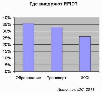 Согласно результатам опроса, активнее всего RFID внедряют образовательные учреждения, транспортные и логистические компании, а также коммунальные службы. Существует и несколько отраслей, где данная технология до сих пор представлена относительно слабо, несмотря на массу привлекательных возможностей. Среди них – предприятия розничной торговли и здравоохранительные учреждения, в которых RFID может применяться вместе с соответствующими приложениями, для автоматической инвентаризации товаров или отслеживания пациентов и лекарственных препаратов. Разумеется, ведущую роль во внедрении RFID продолжают играть крупные компании. 63% опрошенных представителей малого бизнеса заявили, что они вообще не заинтересованы в данной технологии.