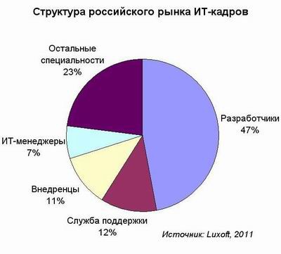 В 2011 году аналитиками ожидается дальнейший плавный рост как количества ИТ-вакансий, так и зарплатных ожиданий кандидатов. По мнению экспертов Luxoft Personnel, существенных изменений в структуре спроса не произойдет, и распределение вакансий останется вполне традиционным. Так, в прошлом году самыми популярными оставались технические специалисты-разработчики, владеющие разными языками программирования. Среди всего количества вакансий они составляют почти половину. Больше всего востребованы разработчики на платформе Java, далее следуют Oracle, C++ и .Net. После них примерно в одинаковом процентном соотношении расположились специалисты службы поддержки и консультанты по внедрению и сопровождению ERP-систем. Только 7% от общего числа вакансий составили управленческие позиции.