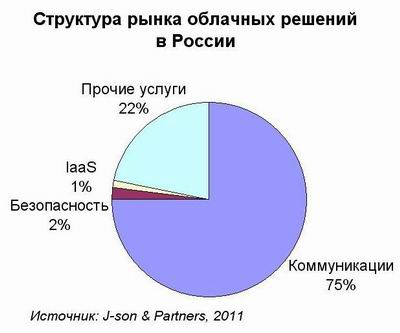По оценкам J-son & Partners Consulting, отечественный рынок облачных услуг в 2010 году составил 133 млн долл. При этом большая часть российского рынка – около 100 млн долл., приходится на коммуникационные услуги - почтовые сервисы, виртуальные АТС и услуги унифицированных коммуникаций. Около 3 млн долл. заработали поставщики облачных решений в сфере безопасности, 700 тыс. долл. – игроки «железного» сегмента облачного рынка (IaaS), а 29 млн долл. пришлось на поставщиков остальных сервисов.