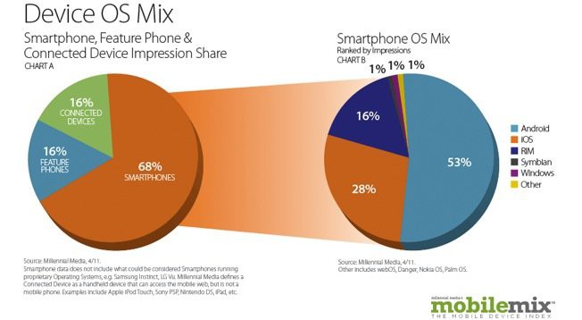 Крупная система мобильной рекламы Millennial Media обнародовала статистику рынка смартфонов за апрель 2011 года. Совершенно неудивительно, что Android продолжает доминировать: с устройств на базе ОС от Google совершается 53% переходов в этой рекламной системе (10% рост по сравнению с мартом). Apple iOS на втором месте с 28% долей (падение на 3%), BlackBerry OS занимает 16%, ну а остальные ОС, включая Symbian и Windows, попали в раздел "другие", которому досталось всего 4% переходов.
