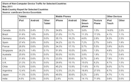 Аналитическая компания comScore проанализировала мировой интернет-трафик на предмет устройств, с которых пользователи выходят в сеть. Таблица по использованию "не ПК" для путешествий по интернету доступна вашему вниманию (кликните по картинке для увеличения):