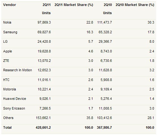 Кстати, в совсем отчете Gartner также коснулась крупнейших производителей смартфонов. И здесь наблюдается серьезное противоречие данным Strategy Analytics, которые поставили Apple на первое место по продажам "умных трубок", Samsung на второе и Nokia на третье. По подсчетам Gartner, финны хоть и "упали" за год на 8 процентов, все равно остаются лидерами с 22,8% долей рынка. Следом идет Samsung с 16,3%, а на 4 и 5 местах LG и Apple с совсем уж несерьезными цифрами - 5,7 и 4,6% рынка соотвественно (по данным Strategy Analytics, у Apple 18,5% доля).