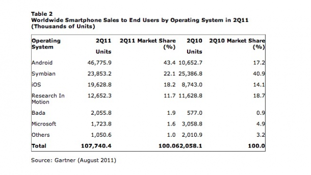 Во втором квартале 2011 года Android получила 43% мирового рынка смартфонов. Это число поражает, ведь только год назад у ОС было не более 17% рынка, рост более чем в два раза. Кстати, по оценкам другой аналитической фирмы, Canalys, у Android и вовсе 48% доля. Вдумайтесь - почти половина ВСЕГО смартфонного рынка! Неудивительно, что Apple сидит как на иголках, ее доля сейчас около 18% и за год выросла ненамного.