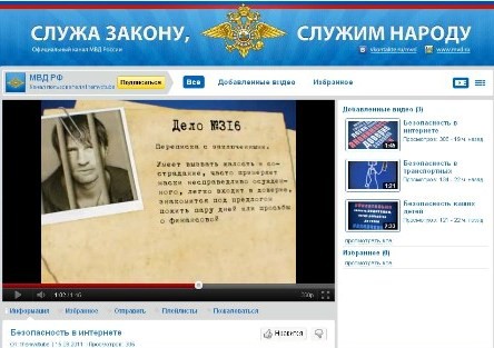 У МВД России появился собственный видеоканал на портале Youtube по адресу http://www.youtube.com/user/themvdtube, - передает ИТАР-ТАСС со ссылкой на пресс-центр МВД РФ. В эфире канала можно увидеть ролики с советами о том, как не стать жертвами преступников и защитить себя и своих близких от злоумышленников. К началу работы нового канала ведомство подготовило три ролика на темы детской безопасности, интернет-мошенничеств и борьбы с преступлениями, совершаемыми на транспорте.
