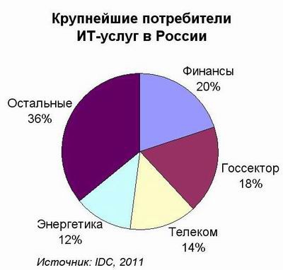 Объем российского рынка ИТ-услуг в 2010 году вырос почти на 30% и составил 4,7 млрд долл. Согласно результатам исследования, проведенного IDC, на первое место по потреблению ИТ-услуг вышел финансовый сектор, потеснив государственные учреждения. С одной стороны, к этому привел дефицит бюджета, приведший к заморозке ряда проектов в госсекторе. С другой стороны, значительное влияние на расклад сил оказало быстрое восстановление банков после кризиса. Доля финансового сектора в общих затратах компаний на ИТ-услуги в прошлом году составила почти 20%, а государственных организаций – лишь 18%. Далее среди крупнейших потребителей услуг следуют телекоммуникационные и энергетические компании. Наиболее высокие темпы роста показал сектор розничной торговли.