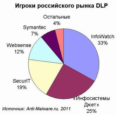 Как и годом ранее, лидируют по объему продаж российские компании InfoWatch, «Инфосистемы Джет» и SecurIT. За ними следуют зарубежные производители Websense и Symantec. Характерно, что зарубежные компании в 2010 году сумели существенно «прибавить в весе». Websense значительно улучшила свои позиции, увеличив долю рынка на 4,5%, и теперь контролирует 12% российского DLP-рынка. Идущая за ней следом корпорация Symantec теперь занимает почти 7% - ее зона влияния расширилась на 2%.