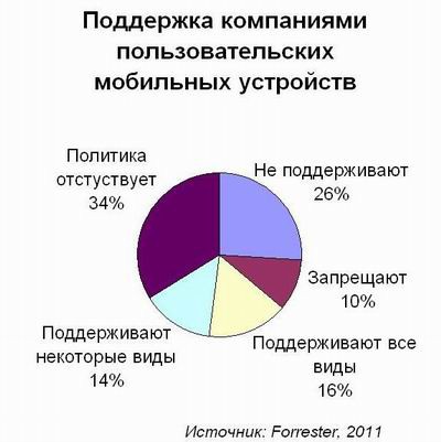 Несмотря на рост использования личных мобильных устройств пользователей в рабочих целях, более трети компаний не обеспечивают никакой их поддержки, либо даже запрещают их использование. Лишь 16% опрошенных Forrester ИТ-менеджеров заявили о поддержке всех типов личных устройств, а 14% отметили, что поддерживают лишь определенные их виды и модели. Некоторые компании разработали масштабные политики, касающиеся вопроса, когда такая поддержка должна осуществляться и какая именно. Наиболее прогрессивные из них уже приобрели ПО для управления парком мобильных устройств, с целью отслеживания состояния самих устройств и используемых на них приложений. Подобные решения довольно важны для обеспечения информационной безопасности: как минимум, они позволяют удалять всю информацию с устройства в случае его кражи или утери.