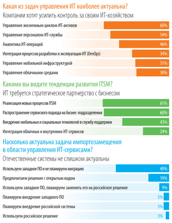 Хотя ITSM все годы своего существования декларирует в качестве основной задачи налаживание партнерских отношений между ИТ и бизнесом, ее решение остается насущной потребностью большинства организаций. 64% участников опроса считают одним из ключевых приоритетов своего ИТ-департамента формирование более эффективных взаимосвязей с бизнесом. Многие из них основной тенденцией развития ITSM на ближайшее пятилетие видят реализацию новых ITSM-процессов для формирования стратегического партнерства между ИТ и бизнесом. Примерно столько же компаний выделили тенденцию распространения сервисного подхода на бизнес-подразделения. 43% респондентов рассчитывают на то, что службы поддержки найдут применение мобильным и социальным инструментам.
