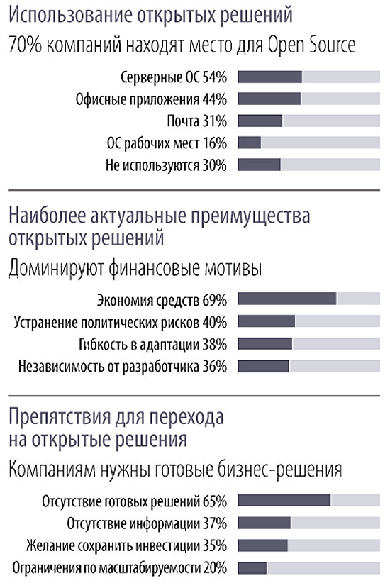 Основное преимущество решений на базе открытых технологий, как следует из результатов опроса, проведенного «Логикой бизнеса», – это возможность сэкономить на лицензионных платежах. Главный же недостаток открытых решений – отсутствие полноценных продуктов, готовых к использованию без доработок, что отмечают представители всех отраслей. Поэтому интеграторы будут активно заниматься (и уже занимаются) разработкой таких систем. Кроме того, многие из тех, кто не собирается переходить на открытое ПО, делают это из желания сохранить инвестиции в существующие решения. Наконец, компаниям не хватает информации об опыте реализованных проектов.