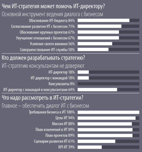 Конечно, ИТ-стратегия не панацея от всех бед и напастей, однако помогает обоснованию ИТ-бюджета и крупных проектов, согласованию развития ИТ с руководством и в целом улучшению отношений с бизнесом. К тому же она нужна не только самим ИТ-директорам и генеральному директору. Сотрудникам ИТ-службы, пользователям, владельцам бизнеса и руководителям бизнес-подразделений она помогает уяснить, в каких направлениях развивается ИТ.