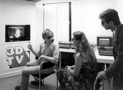 Производители электроники придавали стереотелевидению большое значение уже в 1983 году, когда Philips представила этот прототип на IFA. На заднем плане видны проигрыватели Laserdisk и домашний компьютер Philips P2000T. ПК, выполненный на процессоре Z80 с тактовой частотой 2,5 МГц, был оснащен встроенным кассетным магнитофоном для загрузки программ.