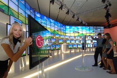 Наряду со стереоскопическими устройствами на IFA последние годы регулярно демонстрировались тонкие телевизоры. Как только размер диагонали экранов перевалил за 100 дюймов, производители стали соревноваться не в величине, а в тонкости телевизоров. На этом фото с прошлогодней IFA можно видеть тонкий плоскоэкранный телевизор LG.