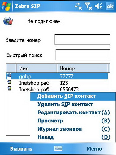 Z-mobile позволяет сохранять в записной книжке смартфона контакты VoIP-пользователей и совершать бесплатные звонки через Интернет другим пользователям сети Zebra-SIP.