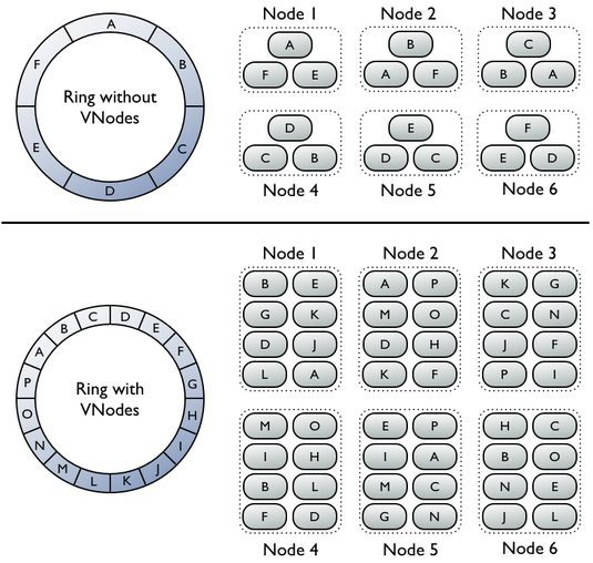 Поддержка виртуальных узлов относится к числу главных особенностей распределенного хранилища данных Amazon Dynamo, которое разработчикам послужило в качестве модели для использования Cassandra. На начальном этапе предпочтение было отдано упрощенной архитектуре, в которой один узел соответствует одному серверу.