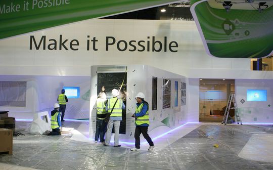 | С марта Huawei проводит глобальную кампанию под девизом Make It Possible, призванную повысить узнаваемость своего бренда. На фото — сооружение стенда компании на конгрессе MWC 2013. Источник: Huawei |