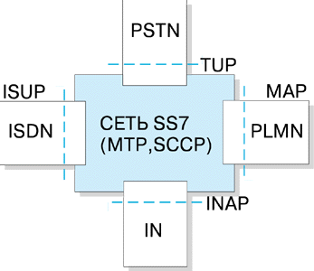 На рис. 7 иллюстрируется роль сети SS7 как единой транспортной среды для обеспечения взаимодействия всех типов цифровых сетей связи.