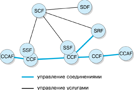 7) SSCP (Service Switcing and Control Point): узел коммутации и управления услугами. Данный узел объединяет узлы коммутации и управления услугами и выполняет функции коммутации услуг SSF, управления вызовом CCF, управления услугами SCF, поддержки данных SDF, управлением доступа вызова CCAF и, возможно, функцию специализированных ресурсов SRF.