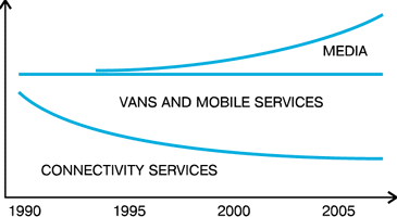 В 1956 году была введена в эксплуатацию первая морская подводная кабельная система стоимостью около 6 млн. долл. на один канал, что определило исходную стоимость использования примерно 75 долларов в минуту. К 1976 году стоимость сократилась уже в сотни раз. Таким образом, основной движущей силой внедрения новых услуг в то время являлось сокращение стоимости базового соединения, что предопределило выход на рынок групп пользователей, требующих новых типов услуг, кроме традиционной по установлению двуточечного соединения. Это явилось началом переходного периода изменения структуры индустрии телекоммуникаций в направлении технологий предоставления новых услуг связи. Темп изменений был невысоким ввиду необходимости фокусироваться на основной задаче - обеспечения пользователю экономически эффективных и качественных соединений. Кроме того, в таких условиях слабо развивался маркетинг рынка услуг связи, несмотря на наличие на нем потенциальных клиентов.