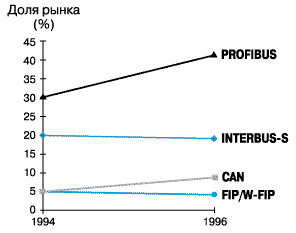 На рис. 2 показано распределение европейского рынка полевых систем в 1996 году. Сравнение с 1994 годом показывает, что произошли резкие перемены, самая важная из которых - увеличение доли PROFIBUS c 30 до 42%, причем это достигнуто за счет частных архитектур.