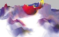 Построение трехмерных рельефов по двухмерным изображениям - это одно из приложений, которое легко реализуется с помощью интерактивных векторных полей. Индексная треугольная сетка образует основу формирования поверхности рельефа. На рис. 4 показана одна из таких сеток, раскрашенная в соответствии с заданным изображением. В данном примере изображение 50х50 пикселов было передано на индексную треугольную сетку 50х50 вершин. На рис. 4а показано векторное поле, направленное по нормали к исходной сеточной поверхности, которое использовалось для изменения высоты вершин сетки. В интерактивном режиме задавалось перемещение этого поля по сетке. Полученные в результате поверхности, представлены на рис. 4в и рис. 4с. Чем дольше задерживалось поле в некоторой точке, тем больше была высота вершин сетки в этом месте. Естественное приложение описанной методики - это построение трехмерных рельефов по плоским фотографиям.