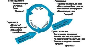- Реализация (build). На этой фазе происходит фактическая реализация текущей стадии проекта. Выполняется трансформация данных, создается начальная база, вместе с потенциальными пользователями системы проектируется интерфейс. Как только данные становятся доступны, начинается процесс подтверждения их качества.