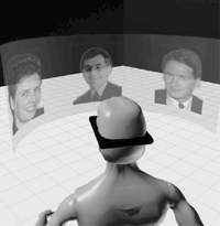 | Рис. 5. Пространственная конференция. Носимый компьютер перемещает источник звука голоса в место нахождения виртуального оратора. Пространственный вспомогательный сигнал приближает общение с виртуальными участниками к реальной жизни. (Рис. Ника Даера). |