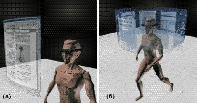Рис. 4 показывает разницу между фиксированным и пространственным дисплеями. На рис. 4а изображение не выходит за рамки плоской «страницы». Пользователь видит одну и ту же информацию независимо от угла наклона и поворота головы. На рис. 4б компьютер создает виртуальный информационный «цилиндр», окружающий пользователя. В каждый момент он видит лишь определенную часть информации. Другие ее части компьютер отображает, вращая цилиндр вокруг неподвижной головы носителя или следуя за ее поворотом. Для дальнейшего повышения производительности такого интерфейса можно добавить пространственные вспомогательные элементы, - например, объемный звук, исходящий из места нахождения информации или визуальные сигналы, указывающие пользователю, куда повернуть голову.