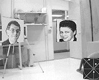 | Рис. 6. Опытная реализация идеи пространственной конференции, изображенной на рис. 5. Изображения удаленных участников наложены на реальный мир, видимый локальному участнику конференции |