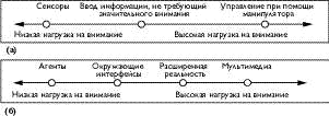 В большей степени подходят предложенные Роудзом окружающий и агентский интерфейсы [6]. Интерфейсы ввода и вывода такого типа можно подразделить по степени потребности во внимании пользователя. Роудз классифицирует различные виды механизмов ввода и вывода в зависимости от степени нагрузки на внимание пользователя. Как показано на рис. 3а, пассивные сенсоры (например, микрофоны), вообще не требуют внимания; интерфейс же, непосредственно управляемый манипулятором, напротив, требует максимального внимания пользователя. Вывод аудиовизуальной мультимедиа-информации также требует много внимания, а агентские технологии, автоматически действующие «в интересах» пользователя, отвлекают внимание незначительно. Между этими крайностями находятся окружающие интерфейсы, общающиеся с пользователем при помощи не отвлекающих внимания сигналов (например, фонового шума); а также интерфейсы расширенной реальности, накладывающие информацию на реальный мир. Выбор механизмов ввода и ввода информации зависит от задачи и типа информации, которой надо управлять. Например, если пользователь участвует в важном совещании и не хочет, чтобы его беспокоили, самым подходящим будет окружающий интерфейс. Однако если носимый компьютер используется в экстремальных условиях, - например, для поиска жертв стихийного бедствия, - лучше всего выводить информацию при помощи наложения на реальный мир.