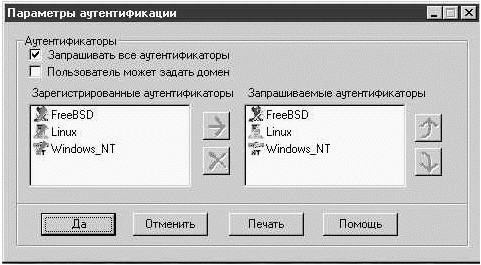 Aker позволяет задать режим, при котором будут опрашиваться несколько аутентификаторов в заданном порядке. Если этот режим установлен, межсетевой экран опрашивает все аутентификаторы по списку, пока не получит утвердительный ответ или пока не исчерпает весь список. Если режим сброшен, то поиск закончится на первом же аутентификаторе, который пришлет подтверждение или сообщение о неверном пароле.