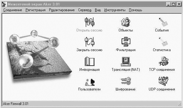 Межсетевой экран Aker (http://www.alpha.ru/Products/Aker) можно отнести к классу пакетных фильтров с контролем состояния (stateful inspection packet filter), хотя ряд сервисов (Telnet, HTTP, HTTPS, Gopher, FTP и SMTP) могут поддерживаться и при помощи proxy серверов. Экран функционирует на платформе FreeBSD, однако при инсталляции ядро ОС модифицируется. Для управления межсетевым экраном можно использовать интерфейс командной строки или удаленное рабочее место администратора, реализованное под NT или Windows 95. Нормальная работа Aker требует компьютера Pentium/133 Мгц с 32 Мбайт памяти (при активном применении VPN память необходимо увеличить). Число поддерживаемых сетевых интерфейсов ограничивается только возможностями системы (незанятыми слотами и прерываниями). Можно выделить следующие основные модули Aker:
