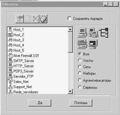Для описания правил необходимо сначала составить описание объектов. В Aker используются следующие типы объектов: хост, сеть, набор (хостов или сетей), протокол (группа протоколов), аутентификатор (рис. 3). Это позволяет облегчить процесс создания правил и внесения изменений в них при коррекции параметров защищаемой сети. Например, при изменении IP адреса хоста достаточно поправить его описание в одном месте, не меняя правил, в которых он задействован (рис. 4).