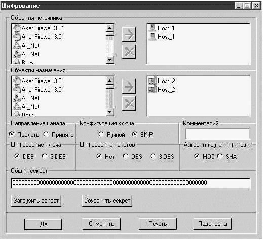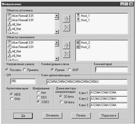 При организации VPN важную роль играют алгоритмы шифрования, электронной подписи и механизмы раздачи ключей. Как правило, все экспортные варианты межсетевых экранов, созданных в США, Канаде или Израиле используют длину ключа от 40 до 56 разрядов, что абсолютно не обеспечивает должного уровня защиты. Aker не страдает от экспортных ограничений. На данный момент для шифрования используются алгоритмы DES (56 разрядов) или 3DES (Triple DES) (112 разрядов), а для контроля целостности алгоритмы MD5 с ключом длиной 32 разрядов или алгоритм SHA с ключом длиной до 40 разрядов. При задании защищенного канала необходимо описать канал в прямом направлении и в противоположном - при этом можно использовать различные алгоритмы для различных направлений.