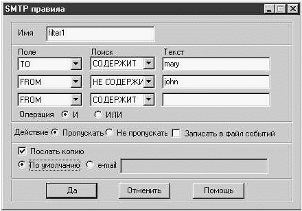 - копирование всех писем, в том числе и не удовлетворяющих правилам фильтрации, на заданный адрес (или несколько различных адресов) - весьма важная возможность для тех организаций, где необходим строгий контроль почтового обмена;