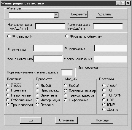 При выборе параметров выборки можно задавать тип пакетов (прошедшие через фильтр, отброшенные и т.д.), тип протокола, модуль, сообщения которого интересны администратору, адреса источника и назначения, диапазон дат. Сообщения можно сортировать по IP адресам или по объектам, а выбранную информацию можно сохранять в файле ASCII. Созданные фильтры можно сохранять для дальнейшего использования. Модуль позволяет также производить действия с файлом статистики - удалять старые записи, уплотнять базу статистики и т.д.