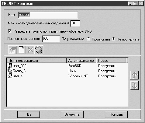 Протокол Telnet широко используется для доступа на компьютеры внутри локальной сети, однако в ряде случаев (например, управление сетевыми устройствами типа маршрутизаторов и т.д.) может применяться и для доступа через межсетевой экран. Proxy сервер протокола Telnet позволяет обеспечить контроль доступа по этому протоколу с аутентификацией пользователей (рис. 10).