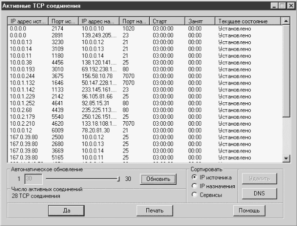 В результате, администратор может наблюдать за всеми проходящими через межсетевой экран соединениями и в случае необходимости прерывать их.