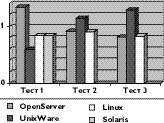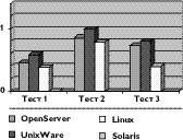Основной результат выполнения второго теста приведен на рис.5 - UnixWare и Linux выполнили приложение OpenServer почти в два раза быстрее, чем OpenServer. При этом Linux незначительно превзошел UnixWare по быстродействию.