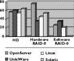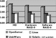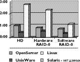 Solaris. Что касается этой операционной системы, то нам сложно сделать какие-либо окончательные выводы, поскольку ряд тестов, которые были выполнены на других платформах, оказалось невозможно запустить на Solaris. Кроме того, у нас отсутствовала лицензия на программу Solstice DiskSuite, средствами которой возможна организация массивов software RAID в системе Solaris.