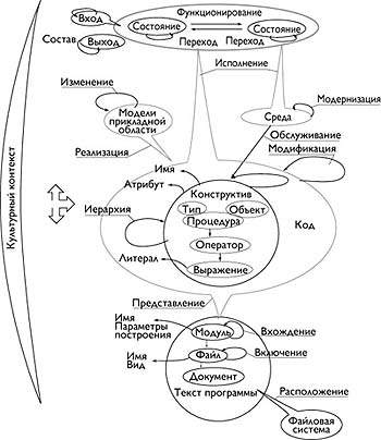 Сам код для современных объектно-ориентированных языков состоит из иерархии конструктивов: типы (классы), объекты (переменные) и процедуры (методы). В свою очередь процедуры представляются иерархией операторов, а компоненты операторов иерархией выражений. Конструктивы связывает не только отношение иерархии, но и отношение обслуживания. Это то же обслуживание, что и с внешней средой. Между кодом и средой нет жесткой границы - сегодня некоторый компонент является частью кода, а завтра он может перейти в среду.