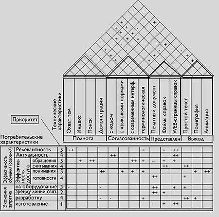 Рассмотрим теперь пример использования дома качества при выборе технических характеристик программного продукта в аспектах его пользовательской документации и справочного обеспечения (рис. 3). На этом примере проиллюстрируем особенности QFD- метода и наметим направления его развития.