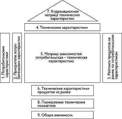 Основа QFD - построение фигурной матрицы, названной в соответствии со своей формой «Дом качества» (рис. 2), в рамках которой фиксируется информация о качестве продукта и принимаемых решениях.