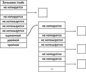 Реализация моментальных снимков в BSD FFS подтвердила свою простоту следующим образом. Во-первых, операции в соответствующей файловой системе быстро завершаются. Во-вторых, допускается завершение всех системных вызовов, записывающих в данный момент времени информацию в такую файловую систему. В-третьих, файловая система синхронизируется с диском, как если бы она была демонтируемой. Наконец, файл с моментальными снимками создается для контроля последовательных изменений в файловой системе; файл с моментальным снимком показан на рисунке 11. Размер этого файла устанавливается равным размеру раздела файловой системы и большинство ее указателей на блок файла маркируются как «некопируемые». Резервируются и копируются несколько стратегических блоков, в частности, содержащие копии карт суперблоков и групп цилиндров. Файл с моментальным снимком также использует выделенный номер блока (1), для маркировки всех блоков как «неиспользуемых» во время выполнения моментального снимка, поскольку нет необходимости копировать блоки, если они позже будут зарезервированы и записаны.