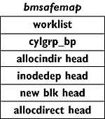 | bmsafemap | Контролирует зависимости битовых карт (указывает на списки структур зависимостей для недавно зарезервированных блоков и индексных дескрипторов) | Блок группы цилиндров |