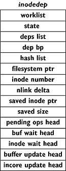 Прототипная реализация в общем случае применяла две структуры для каждой зависимости обновления. Одна из них была связана с данными, которые должны быть записаны, и одна - с данными, которые зависят от операций записи. Например, каждый раз при резервировании нового блока с резервируемым блоком на диске, битовой картой, из которой блок был зарезервирован, и индексным дескриптором, указывающим на новый дисковый блок, связывались новые структуры зависимостей. Структура, связанная с индексным дескриптором, зависела от того, записаны ли две других. Программа мягких обновлений 4.4BSD использует одну структуру зависимостей (связанную с дисковым блоком) для описания резервирования блока. С каждой битовой картой и каждым индексным дескриптором связана только одна структура зависимостей, и все соответствующие структуры резервирования блока связываются со списками, на которые ссылаются эти структуры. Другими словами, со списком зарезервированных блоков, списком битовых карт и списком индексных дескрипторов связана только одна структура резервирования блока. За счет создания списков, а не использования отдельных структур, требования к памяти были снижены почти на 40%.