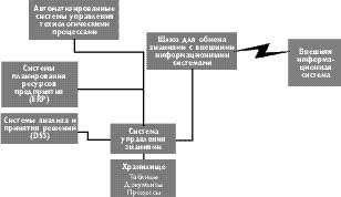 Самым нижним уровнем информационной системы является хранилище, в котором содержится вся интеллектуальная собственность предприятия. Это могут быть документы, справочники, структурные таблицы, деловые правила, описание процессов. Прямого доступа к хранилищу быть не должно, как для пользователей, так и для различных систем предприятия. Прямой доступ имеет лишь система управления знаниями, которая служит своего рода шлюзом для остальных систем и формирует информационное окружение предприятия. Система управления знаниями объединяет идеи, знания, содержание документов и деловые правила, автоматизируя процессы, базирующиеся на знаниях, как внутри предприятия, так и между разными организациями. Для этого нужен шлюз, позволяющий производить обмен данными с внешними системами. Это необходимое условие, так как современные процессы направлены на объединение предприятий в крупные концерны и очевидно, что передача знаний очень важна. Например, системы планирования ресурсов предприятия (ERP - enterprise resource planning) не могут работать независимо - процессы, связанные с управлением финансами, складами, человеческими ресурсами, используют уже накопленные знания и приносят новые.