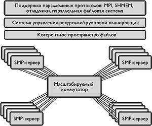 Системы внешней поддержки. Используя внешние сети передачи данных, система может подсоединяться к множеству серверов внешней поддержки, например, к файл-серверам и специальным средствам разработки ПО. Однако можно сконфигурировать и специальный внутренний раздел (состоящий из некоторого подмножества вычислительных узлов), который будет предоставлять сервис по входу в систему или по компиляции программ, а также обеспечивать хранение каталогов пользовательских файлов.