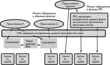 Параллельная файловая система. Если CFS обеспечивает масштабирование общей полосы пропускания файловой системы для обращений к файлам, которые обслуживаются разными серверами, то параллельная файловая система PFS дает возможность масштабирования полосы пропускания для одного задания в рамках домена CFS посредством расщепления данных одной параллельной файловой системы по нескольким нижележащим файловым системам. Это позволяет параллельно выполнять обращения от различных процессов параллельного задания и обслуживать эти обращения совместно работающими файловыми серверами. Когда параллельная файловая система создается администратором, специфицируются составляющие ее файловые системы и принимаемый по умолчанию размер расщепления. Для программиста PFS использует POSIX-совместимые синтаксис и семантику.