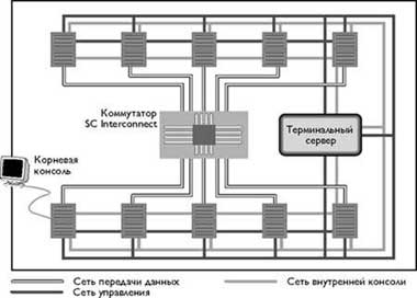 - сети внутренней консоли - последовательный порт каждого узла системы подсоединяется к терминальному серверу. В свою очередь терминальные серверы подсоединяются к внутренней сети управления. Такая конфигурация позволяет обеспечить доступ по сети управления к консольному порту каждого узла посредством IP-протокола. Это средство предоставляет программному обеспечению управления доступ к консольной подсистеме узла (для начальной загрузки, контроля питания, опроса конфигурации, модернизации фирменного ПО и т.д.).